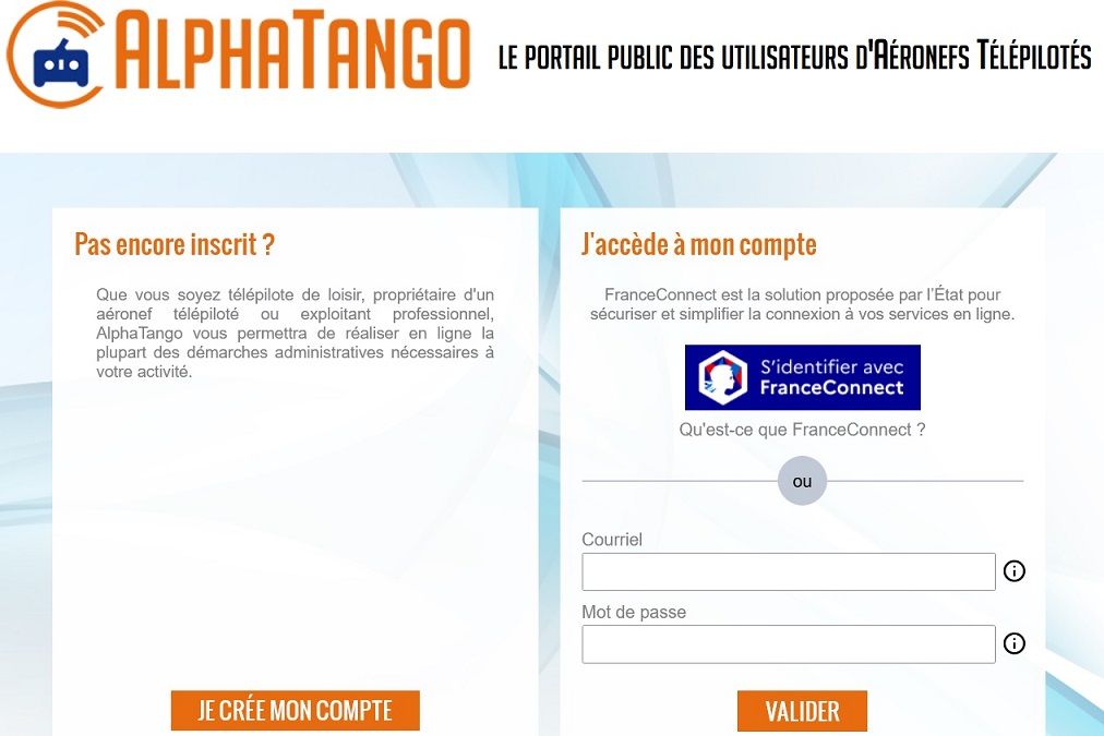 Enregistrement de l’exploitant d’UAS (Unmanned Aerial Vehicle. ) sur Alpha Tango auprès de la DSAC.