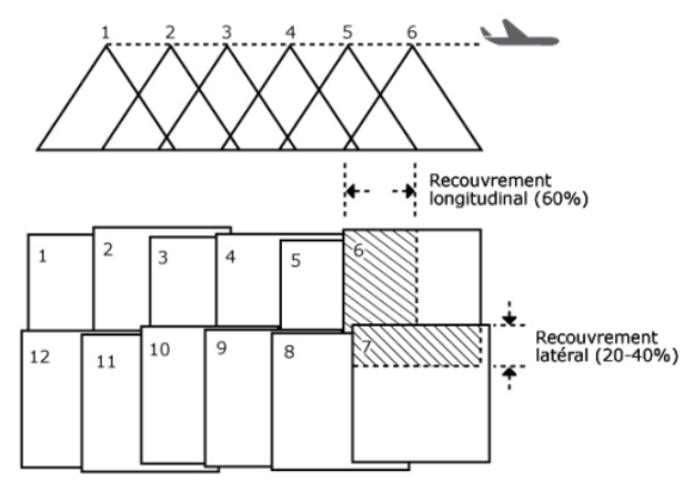 Ces photos permettent l'assemblage d’une mosaïque d’images qui sera traitable par un logiciel de photogrammétrie.