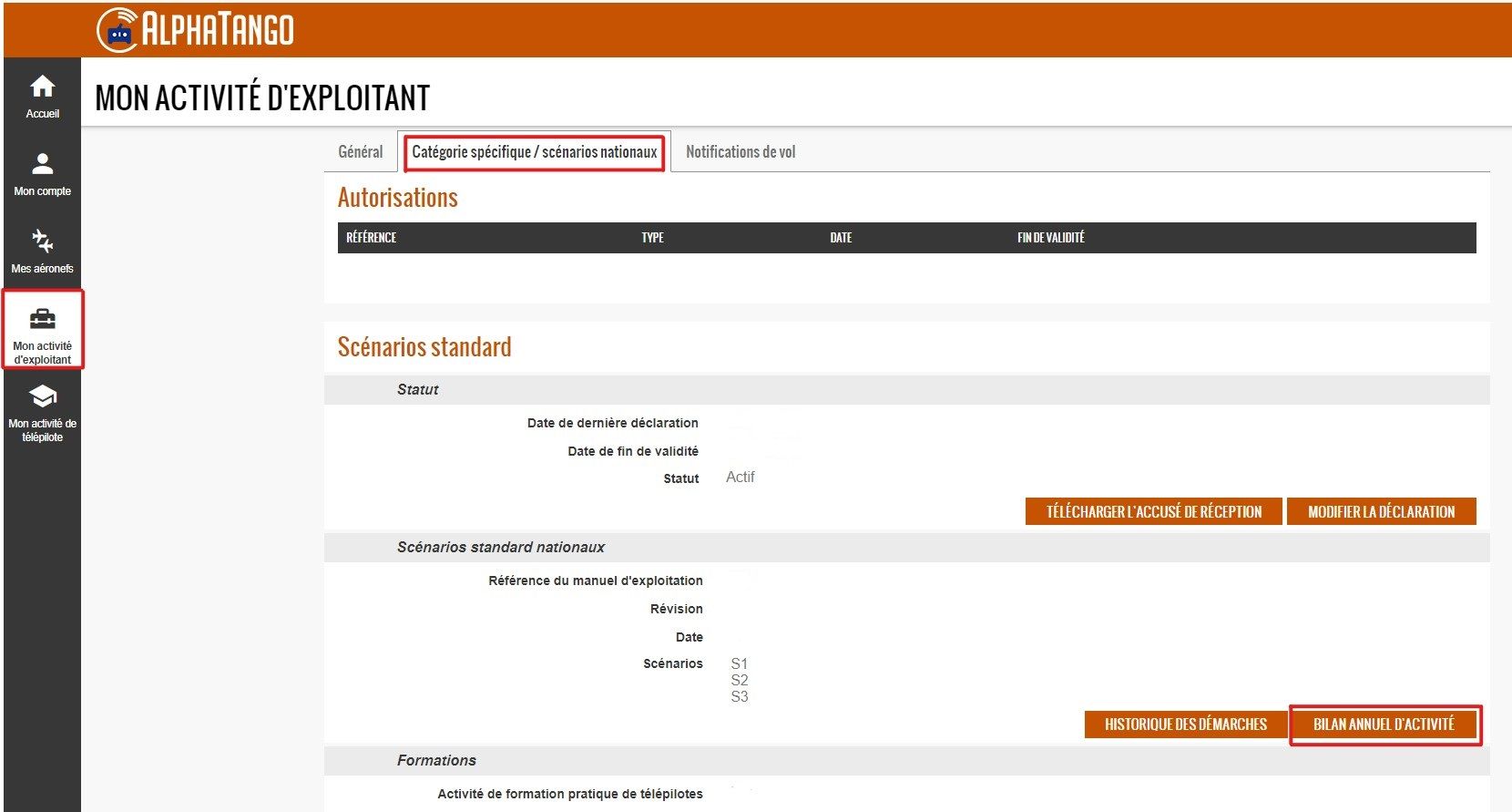 Un Exploitant d'UAS doit, pour opérer dans la catégorie « spécifique » dans le cadre des scénarios standard nationaux (S1 – S2 – S3), doit créer un compte sur le portail AlphaTango, et demander une autorisation d'exploitation à la DSAC.