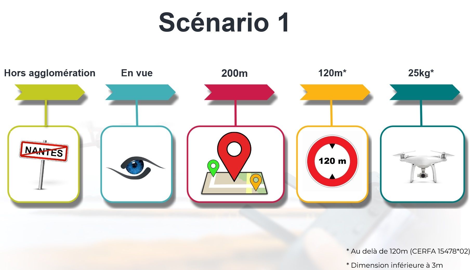 Dans la réglementation drone, on détermine un scénario en fonction de l’emplacement de la zone d'évolution.