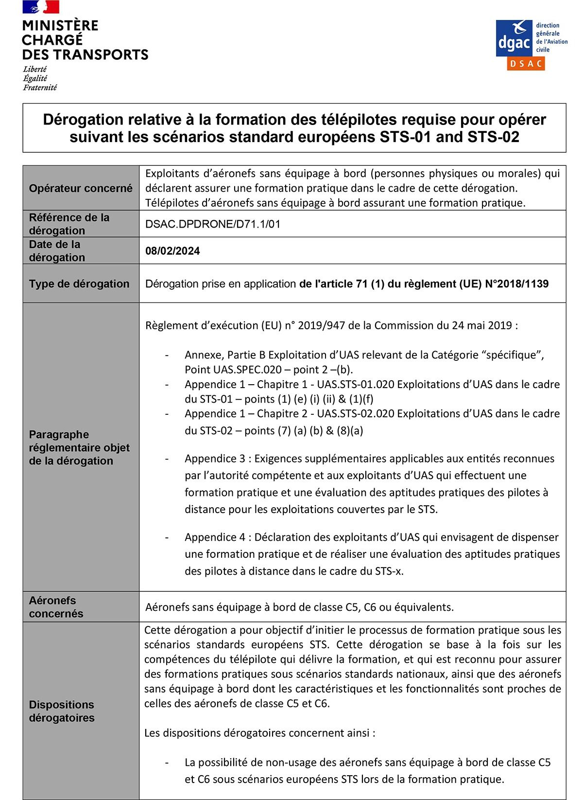 Une dérogation de 8 mois est donnée aux centres de formation, pour la formation pratique STS. Elle vise à compenser le retard pris par la France et le manque de drones homologués C5 et C6.